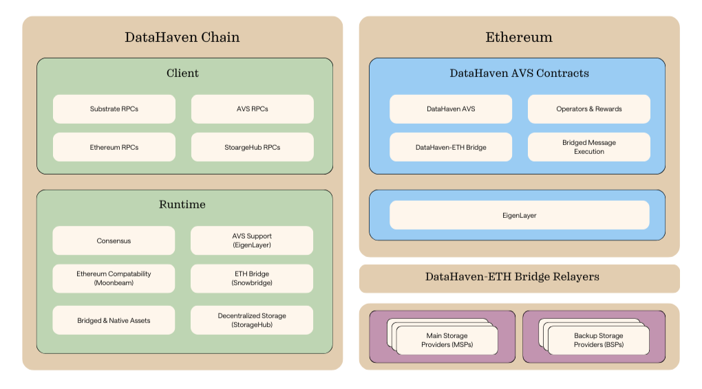 DataHaven’s foundational architecture as a Layer 1 blockchain, built using the Substrate framework, enables deep-level customizations at the core protocol level that go beyond the capabilities of smart contracts. These inherent optimizations are crucial for effectively serving DataHaven’s intended use cases. The following sections detail the additions made to the runtime and client to add full Ethereum compatibility and decentralized storage capabilities, and for the chain to operate as an EigenLayer AVS and therefore benefit from Ethereum’s shared security.